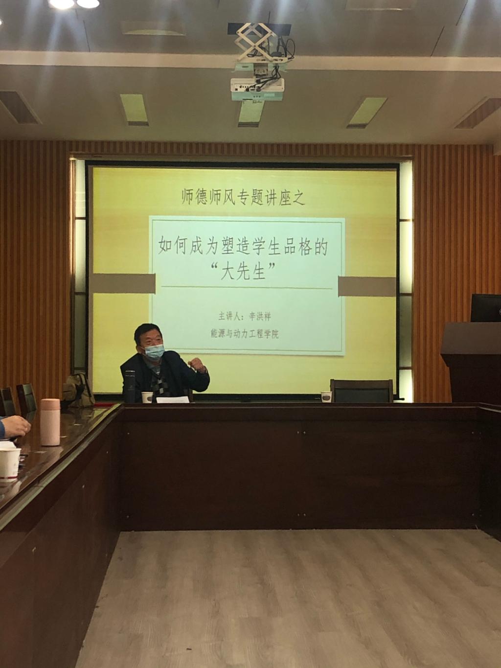 辛老师首先引用习总书记在全国高校思想政治工作会议的讲话开篇:“一个人遇到好老师是人生的幸运,一个学校拥有好老师是学校的光荣,一个民族源源不断涌现一批又一批好老师则是民族的希望。”教师不能只做传授书本知识的教书匠,而要成为塑造学生品格、品行、品位的“大先生”。随后辛老师从自身从教40余年的经历出发,总结了要成为“大先生”需具备的品质和能力:坚定而正确的政治立场和思想、高尚的道德情操、先进的教学理念、丰富的知识储备、较强的业务能力、灵活的教学方法、较高的教研水平和有效的育人技巧。辛老师勉励教师应真正把教书育人和自我修养相结合,以德立身、以德立学、以德施教,努力做到人格高尚、行为世范,深入学生、因材施教,宽严相济、言传身教,当好学生成长的引路人。