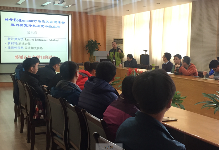 接着,杲东彦老师进行了题为“格子Boltzmann方法及其在泡沫金属内相变传热研究中的应用”的学术分享,主要从三个方面展开:Lattice Boltzmann Method这一新计算方法,超轻多孔泡沫金属这一新材料,以及固液相变传热这一非线性传热。参加会议的青年教师就学术研究方面与杲老师进行现场交流讨论。