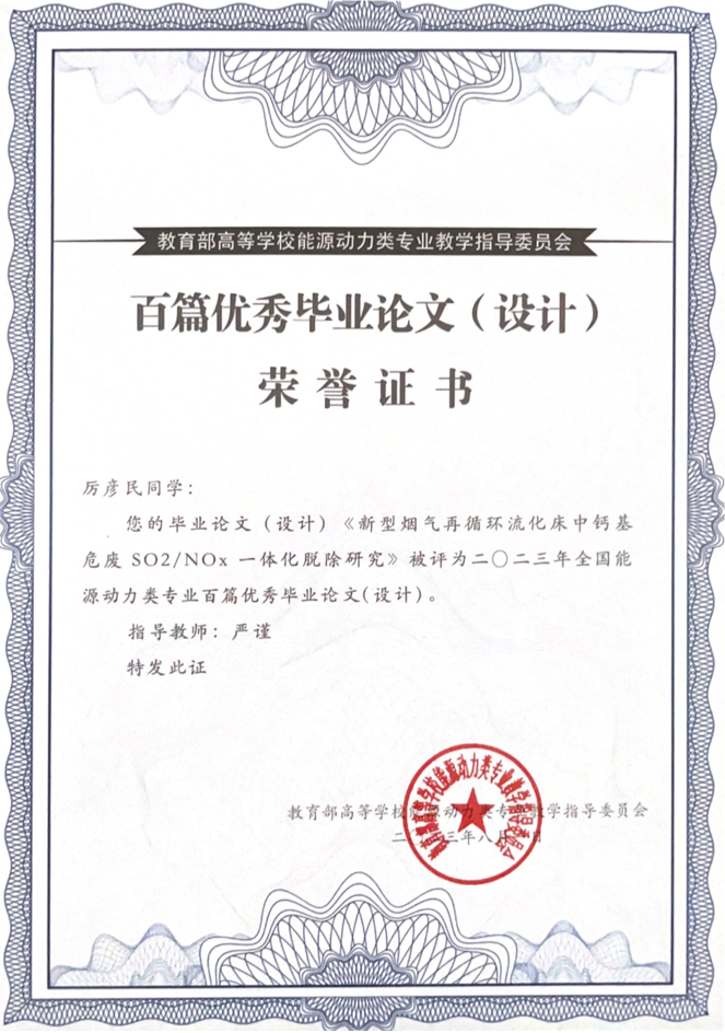 8月4日,教育部高等学校能源动力类专业教学指导委员会公布了2023年百篇优秀本科毕业论文(设计),由AV研究所严谨老师指导的集控191厉彦民同学本科毕业论文《新型烟气再循环流化床中钙基危废SO2/NOx一体化脱除研究》入选,这是AV研究所首次获得该奖项。