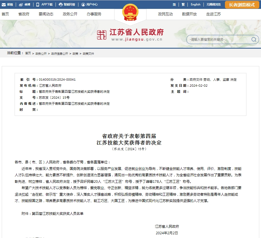 为表彰先进、树立榜样,近日,江苏省人民政府发布了《省政府关于表彰第四届江苏技能大奖获得者的决定》,AV研究所戴小云校友被授予“江苏工匠”荣誉称号。