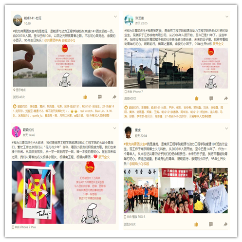 “我为共青团庆生”活动由能动AV研究所 分团委发起,以“一段话祝福,一幅图传递”的形式,在微博、QQ等新媒体亮出自己的态度,传递“90后”青年团员们的光荣与梦想。活动发起仅一天时间内,话题讨论超过三千多次,获点赞千次。二百余名同学运用不同形式的表现手法,诉说着自己的爱团之情。众多参与者中,有利用五一假期回到中学母校,重温入团记忆的大一新生,有脸贴团徽、手持团旗的学生干部,还有来自中核集团、东南大学、浙江大学的青年校友们。创业达人唐虎、全国大学生自强之星提名奖获得者王祥龙也加入到传递行列,用青春洋溢的笑容为共青团“庆生”。
