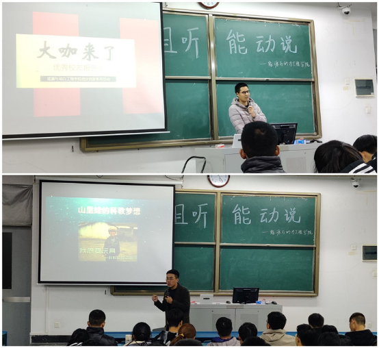 下半场“大咖来了——优秀校友报告会”由现任南京乾纬智能科技有限公司执行董事乔成雪、现任南京创翼少儿科教技术有限公司总经理,南京卓越青少年科技创新能力发展中心创始人唐虎两位校友担任主讲嘉宾。乔成雪分享了他的学习及工作经历,就“如何发现创新点”、“什么样的创新是成功的”、“怎样去完善”这三个问题进行探讨和交流,为现场同学提供参加 “互联网+”大赛的新思路。唐虎则以“山里娃的科教梦”为主题,结合自身经历,通过“小时候的梦想”、“追梦过程的不懈坚持”、“现在的自己”等方面,让同学们感受到不断追求梦想的力量,坚定了学生们创新创业的信心。