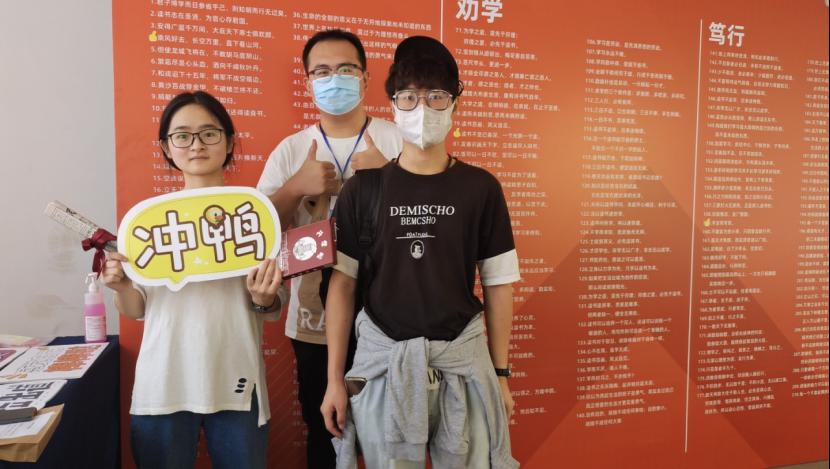迎新点,由立德、劝学、笃行、修身、励志、奋斗等六个版块组成的“我的大学”巨幅展架赢得新生关注,展架上共计420条人生格言,每条格言对应一个礼盒。盒子上印有学校校训、校园精神、公众号二维码,盒子里既有口罩等日常防疫用品,也有AV研究所