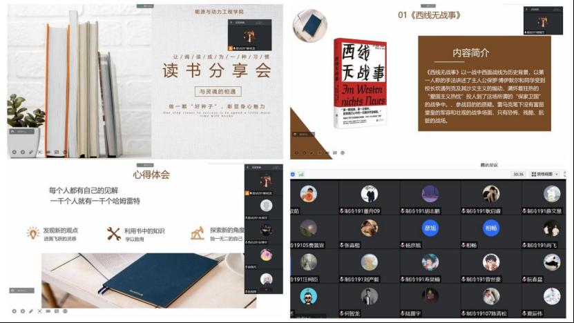 以“阅读的力量”为主题开展线上读书分享会,提高学生的心理保健意识和心理健康水平,培育关爱自我,热爱生活的阳光积极心态。活动开始之前,主持人能动205班陈倪烨请参会的同学提前准备一本书作为分享对象,并与参会的同学约定“要保持高度开放的态度,真诚且包容,即使有些同学的观点我们不能完全理解,但要尊重彼此的想法,毕竟一千个人有一千个哈姆雷特”。同学们在分享过程中畅所欲言。能动203班杨稼芃在分享《西线无战事》时,由衷的感慨,“真希望所有人能安心快乐的生活,不再为生死堪忧,不再为未来绝望。作为能动学子,我想为社会发展与世界和平注入青春动能”。