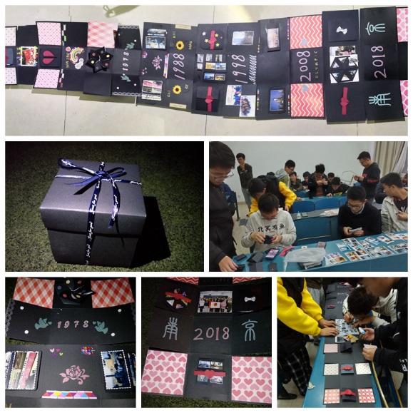 这是一个里面“塞”满了东西快要爆炸的盒子,在网络上有个时髦的名字——“爆炸盒子”。翻开纸盒,各种精巧的手工作品扑面而来,贴纸、彩色胶带、艺术字体、插画、干花、小机关、照片都记录着南京改革开放四十年的时代变迁。“今年是中国改革开放四十周年,作为新时代的新青年,我们该用怎样的方式致敬改革开放呢?”谈及制作初衷,活动策划者能动171团支部田茹梦同学这样介绍道,“最近网络中热度颇高的‘爆炸盒子’被誉为‘表白神器’,为很多人的生活增添了惊喜与感动。我们何不用这样的载体来表白祖国、记录改革开放给我们的第二故乡——南京带来的具体变化呢?纸盒可以留住我们平凡美好的生活细节,也一定可以承载起城市变迁进步的宏大主题。”这样的创意得到了支部成员的积极响应。同学们合理分工,有的负责历史事件梳理,有的负责设计制作小机关,有的负责手工绘画,有的负责统筹制作。他们以十年为时间段,每十年发生在南京的大事件或者是老百姓现实生活中的重大变化用纸盒中的内页来呈现,传递着青春正能量。