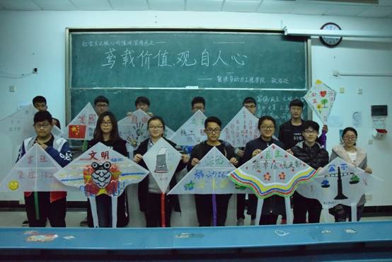 此次活动得到了各团支部的积极响应。活动中,同学们自主选择风筝样式进行框架组装,并围绕社会主义核心价值观这一主题选择关键词在风筝上进行创作。活动现场其乐融融,青年团员们用图画及文字诠释着自己对核心价值观的感悟以及对未来的展望。能卓161团支部以百花齐放为元素表达对民主的向往与追求,暖通161团支部利用小篆书法体现24字的核心价值观,集控161团支部代表则围绕“自由”这一关键词,大胆创意,在风筝上印上了五彩手掌印。