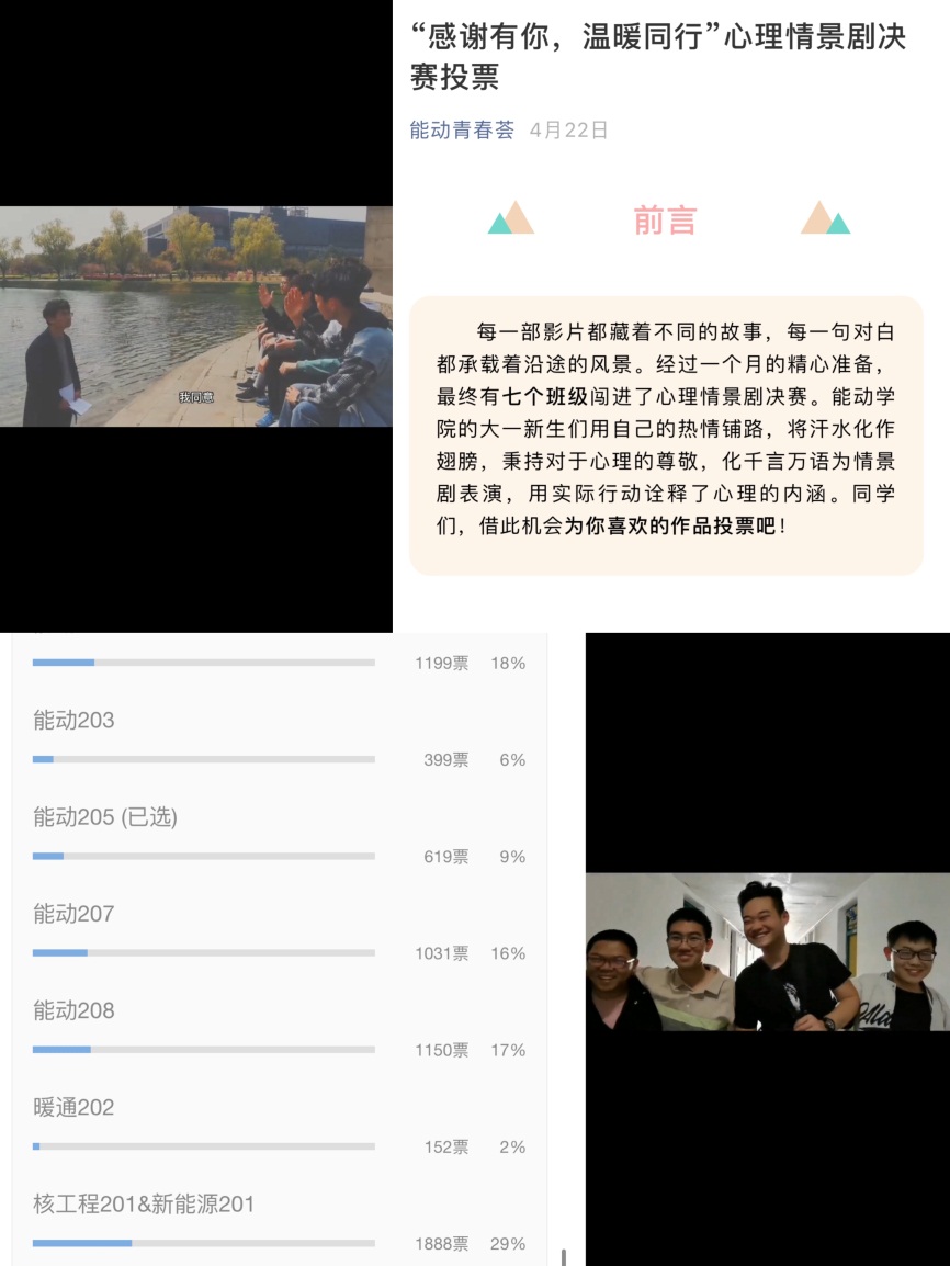 本届心理情景剧大赛创新活动形式,采用视频拍摄、线上投票、线下打分等方式,充分调动同学们的积极性和主动性。经过各班初赛,最终有7个参赛队伍脱颖而出进入决赛,表演剧目分别从不同视角,生动而又深刻地演绎了大学生在自我探索和成长过程中面临的挑战和蜕变,以及表达了自己在喜迎建党100周年之际的所思所想所悟。其中,能动203班的《释怀》描写了男主在初入新环境时的迷茫和不安,然后经过舍友协助、自我调整,从而慢慢适应了集体生活的故事;能动205班的《烟云终散去,心中皓月行》中男主面对父母的不理解,选择自暴自弃,最终在好朋友的帮助下,结合自己的亲身经历慢慢带着男主走出心中的困境;能动208班的《百年前的初心》则是紧扣党史知识,因一份入党申请书引出共产党初建时的艰辛与不易,引导大学生们端正入党动机,不忘初心,牢记使命。经过激烈的角逐,能动208班荣获本次比赛的一等奖。