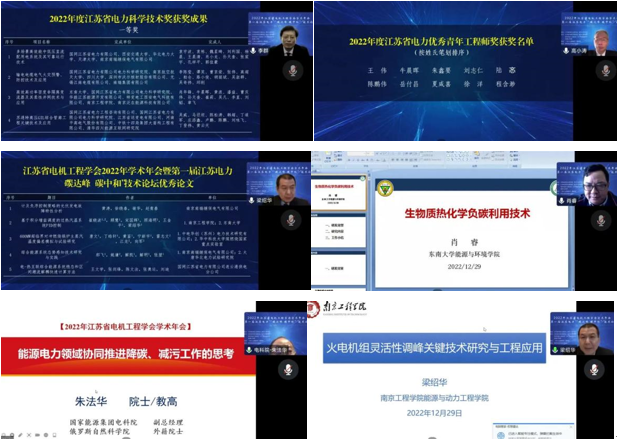 会议宣读了《2022年度江苏省电机工程学会科学技术奖的通报》、《2022年度江苏省电机工程学会优秀科技工作者奖和优秀青年工程师奖的通报》和《江苏省电机工程学会2022年学术年会暨第一届江苏电力“碳达峰 碳中和”技术论坛优秀论文的通知》。东南大学能源与环境AV研究所 院长肖睿教授、国家能源集团科学技术研究院有限公司副总经理朱法华教高、学校AV研究所 院长梁绍华教授分别作《生物质热化学负碳技术》、《能源电力领域协同推进降碳减污工作的思考》、《火电机组灵活性调峰关键技术研究及应用》主旨报告。